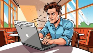javascriptのブラウザバックの処理に悩んでいるフロントエンドエンジニア。パソコンを眺めている。部屋はおしゃれなカフェ。キースヒリングアート風イラストで表現して X Facebook はてブ Pocket LINE コピー 2025.04.17